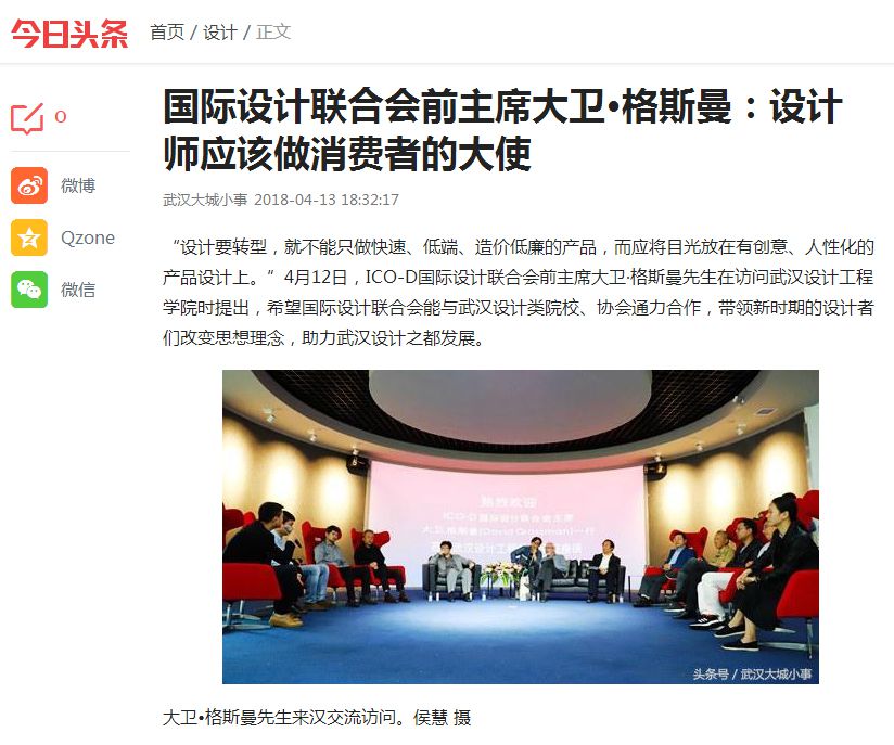 今日头条消息 “设计要转型,就不能只做快速、低端、造价低廉的产品,而应将目光放在有创意、人性化的产品设计上。”4月12日,ICO-D国际设计联合会前主席大卫·格斯曼先生在访问best365中国官方网站时提出,希望国际设计联合会能与武汉设计类院校、协会通力合作,带领新时期的设计者们改变思想理念,助力武汉设计之都发展。