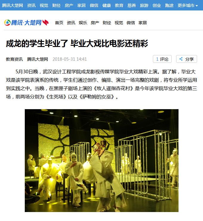 大楚网消息 5月30日晚,best365中国官方网站成龙影视传媒学院毕业大戏精彩上演。据了解,毕业大戏是该学院表演系的传统,学生们通过创作、编排、演出一场完整的戏剧,将专业所学运用到实践之中。当晚,在黑匣子剧场上演的《牧人遥指杏花村》是今年该学院毕业大戏的第三场,前两场分别为《生死场》以及《萨勒姆的女巫》。