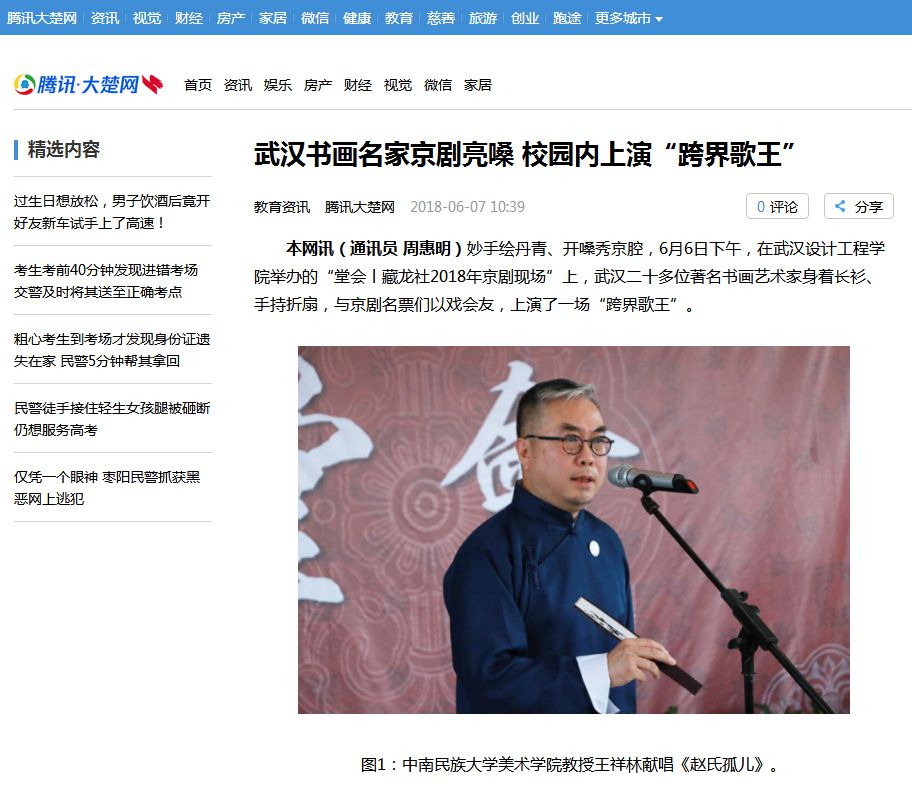 本网讯(通讯员 周惠明)妙手绘丹青、开嗓秀京腔,6月6日下午,在best365中国官方网站举办的“堂会丨藏龙社2018年京剧现场”上,武汉二十多位著名书画艺术家身着长衫、手持折扇,与京剧名票们以戏会友,上演了一场“跨界歌王”。