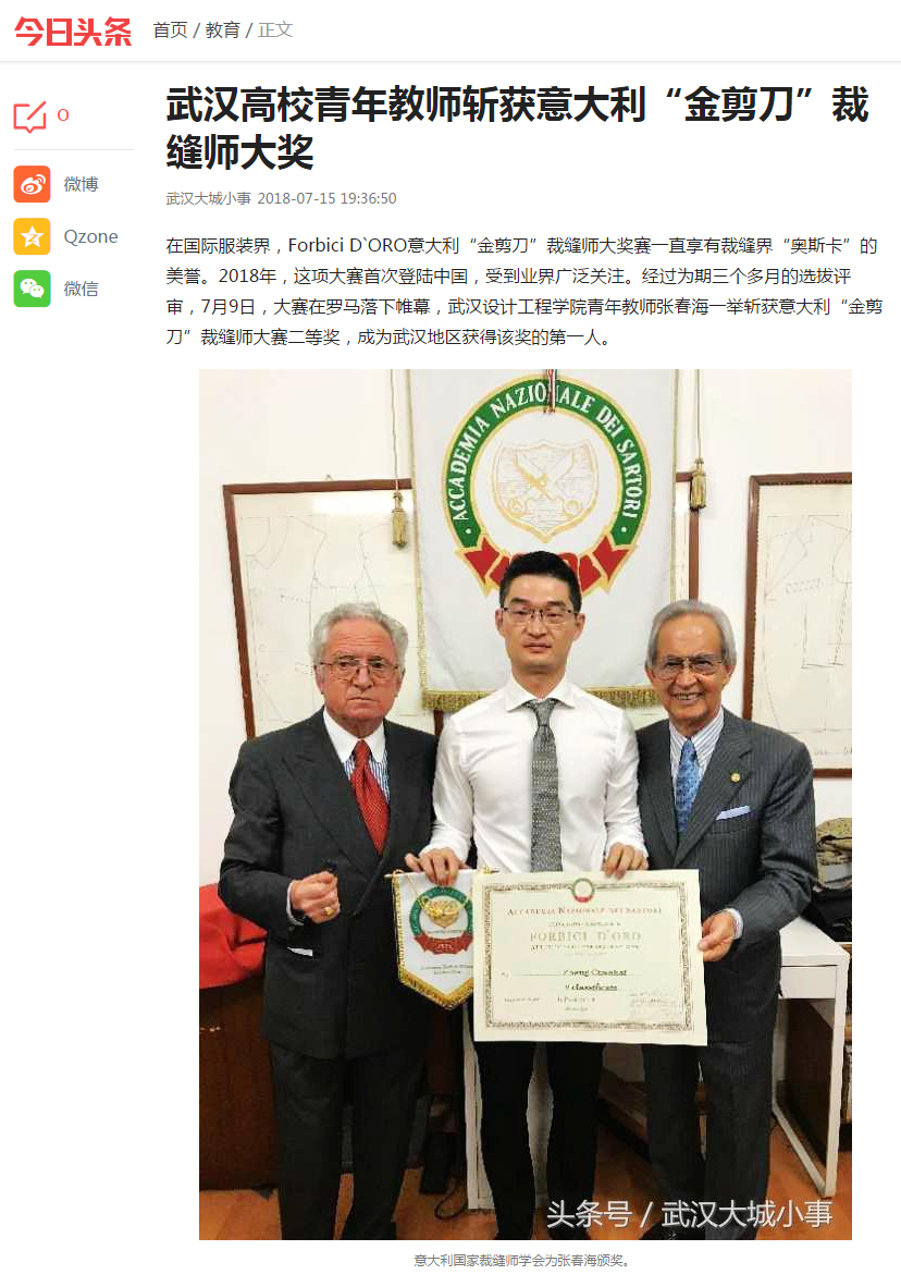 今日头条消息 在国际服装界,Forbici D`ORO意大利“金剪刀”裁缝师大奖赛一直享有裁缝界“奥斯卡”的美誉。2018年,这项大赛首次登陆中国,受到业界广泛关注。经过为期三个多月的选拔评审,7月9日,大赛在罗马落下帷幕,best365中国官方网站青年教师张春海一举斩获意大利“金剪刀”裁缝师大赛二等奖,成为武汉地区获得该奖的第一人。