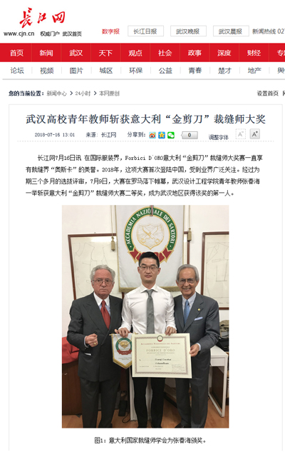 长江网7月16日讯 在国际服装界,Forbici D`ORO意大利“金剪刀”裁缝师大奖赛一直享有裁缝界“奥斯卡”的美誉。2018年,这项大赛首次登陆中国,受到业界广泛关注。经过为期三个多月的选拔评审,7月9日,大赛在罗马落下帷幕,best365中国官方网站青年教师张春海一举斩获意大利“金剪刀”裁缝师大赛二等奖,成为武汉地区获得该奖的第一人。