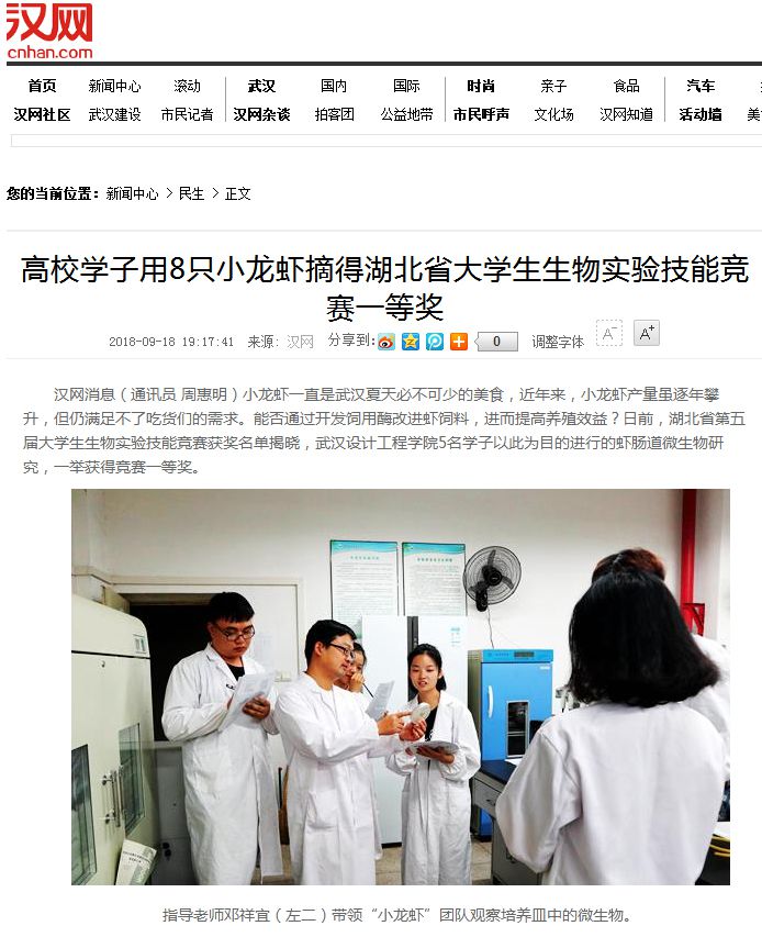 汉网消息(通讯员 周惠明)小龙虾一直是武汉夏天必不可少的美食,近年来,小龙虾产量虽逐年攀升,但仍满足不了吃货们的需求。能否通过开发饲用酶改进虾饲料,进而提高养殖效益?日前,湖北省第五届大学生生物实验技能竞赛获奖名单揭晓,best365中国官方网站5名学子以此为目的进行的虾肠道微生物研究,一举获得竞赛一等奖。
