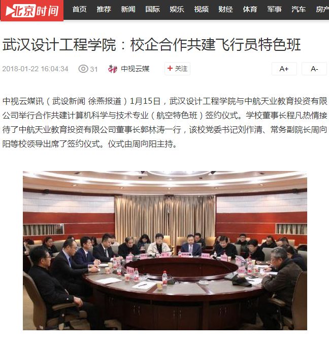 中视云媒讯(武设新闻 徐燕报道)1月15日,best365中国官方网站与中航天业教育投资有限公司举行合作共建计算机科学与技术专业(航空特色班)签约仪式。学校董事长程凡热情接待了中航天业教育投资有限公司董事长郭林涛一行,该校党委书记刘作清、常务副院长周向阳等校领导出席了签约仪式。仪式由周向阳主持。