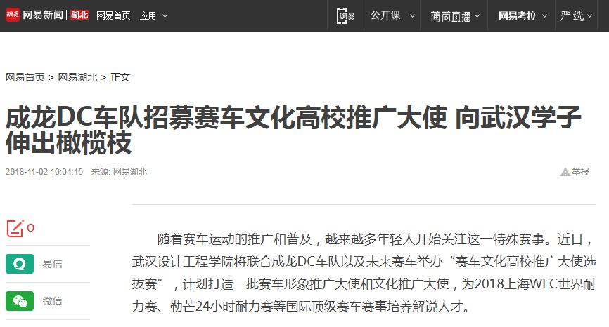 据了解,成龙DC车队由由首个赛百灵华人冠军、3届亚洲勒芒总冠军、华人车手程飞与酷爱赛车的超级巨星成龙先生于2015年共同创办,是国际耐力锦标赛中炙手可热的中国车队。2017年,该车队成为首支站上勒芒24小时耐力赛冠军领奖台的中国大陆车队。11月18日,他们将带领选拔出来的赛车大使一同出征2018上海WEC世界耐力赛。