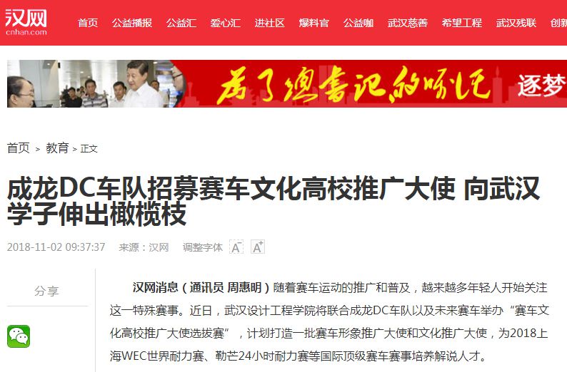 记者从武汉设计工程学院获悉,“赛车文化高校推广大使选拔赛”将于11月2日开启。比赛分才艺展示和演讲两个环节,根据参赛选手表现及综合素质,分别评选出10名高校赛车形象推广大使和10名高校赛车文化推广大使。并将择优选拔4人跟随成龙DC车队参与即将在上海举办的WEC世界耐力赛现场赛事播报。