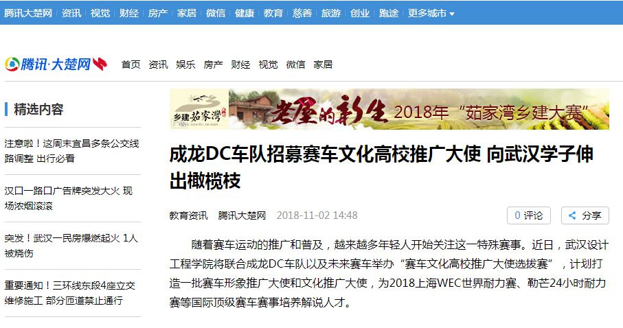 据了解,成龙DC车队由由首个赛百灵华人冠军、3届亚洲勒芒总冠军、华人车手程飞与酷爱赛车的超级巨星成龙先生于2015年共同创办,是国际耐力锦标赛中炙手可热的中国车队。2017年,该车队成为首支站上勒芒24小时耐力赛冠军领奖台的中国大陆车队。11月18日,他们将带领选拔出来的赛车大使一同出征2018上海WEC世界耐力赛。