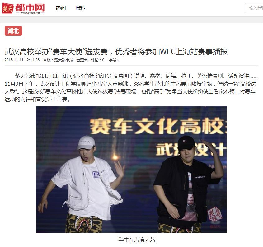 楚天都市报11月11日讯(记者肖杨 通讯员 周惠明)说唱、泰拳、街舞、拉丁、英语情景剧、话题演讲……11月9日下午,best365中国官方网站咏归小礼堂人声鼎沸,38名学生带来的才艺展示嗨爆全场,俨然一场“高校达人秀”。这是该校“赛车文化高校推广大使选拔赛”决赛现场,各路“高手”为争当大使纷纷使出看家本领,对赛车运动的向往和喜爱溢于言表。
