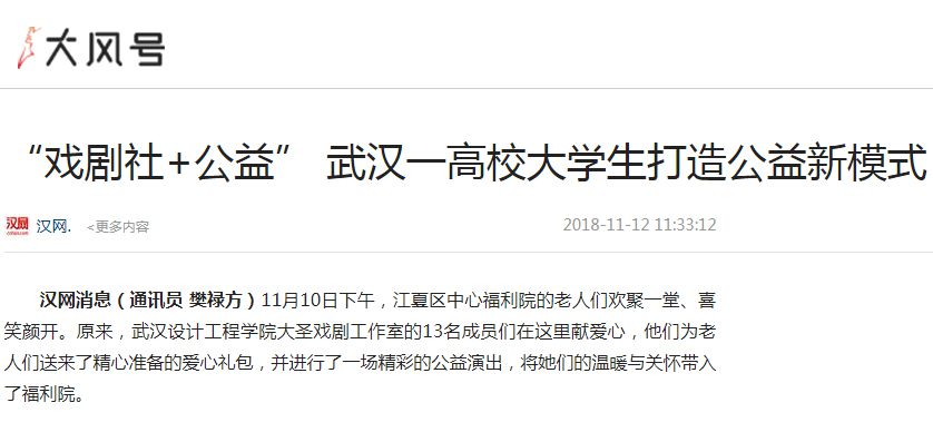 谈起这次行动,查文钰自豪地介绍了他们的“公益史”。据了解,虽然大圣戏剧工作室成立才两年,但是,他们的公益行动却可以追溯到2013年。从那年开始,成员谭嘉豪和李唐明就时常到武汉爱乐音乐学校捐款捐物,为汶川地震后失去双亲与家园的孩子献爱心。2016年10月,大圣戏剧工作室在成立之后,查文钰和吴明杭就开始到武汉市江夏区法泗镇桥头小学,给那里的留守学生教授音乐课,一周一次,他们坚持了半年。现在,支教的火把已经传递给了学弟学妹。今年1月,他们还将通过原创舞台剧演出募集到的1253元,悉数捐赠给一名白血病患者。