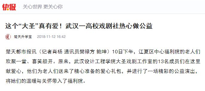 谈起这次行动,查文钰自豪地介绍了他们的“公益史”。据了解,虽然大圣戏剧工作室成立才两年,他们的公益行动却可以追溯到2013年。从那年开始,成员谭嘉豪和李唐明就时常到武汉爱乐音乐学校捐款捐物,为汶川地震后失去双亲与家园的孩子献爱心。2016年10月,大圣戏剧工作室在成立之后,查文钰和同伴吴明杭就开始到武汉市江夏区法泗镇桥头小学,给那里的留守学生教授音乐课,一周一次,他们坚持了半年。现在,支教的火把已经传递给了学弟学妹。今年1月,他们还把通过原创舞台剧演出募集到的1253元,悉数捐赠给了一名白血病患者。