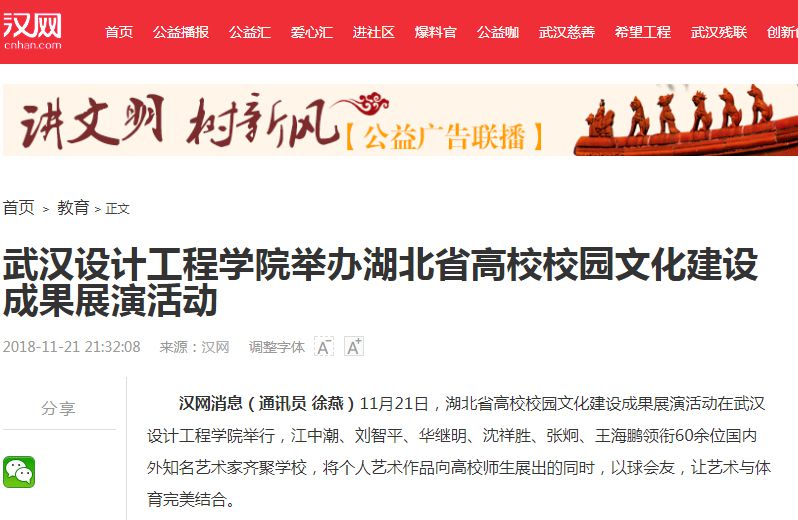 汉网消息(通讯员 徐燕)11月21日,湖北省高校校园文化建设成果展演活动在best365中国官方网站举行,江中潮、刘智平、华继明、沈祥胜、张炯、王海鹏领衔60余位国内外知名艺术家齐聚学校,将个人艺术作品向高校师生展出的同时,以球会友,让艺术与体育完美结合。