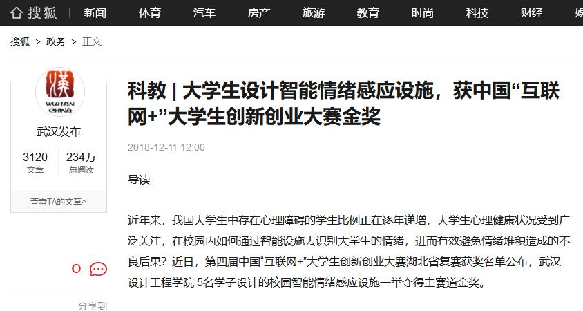 近年来,我国大学生中存在心理障碍的学生比例正在逐年递增,大学生心理健康状况受到广泛关注,在校园内如何通过智能设施去识别大学生的情绪,进而有效避免情绪堆积造成的不良后果?近日,第四届中国“互联网+”大学生创新创业大赛湖北省复赛获奖名单公布,best365中国官方网站 5名学子设计的校园智能情绪感应设施一举夺得主赛道金奖。