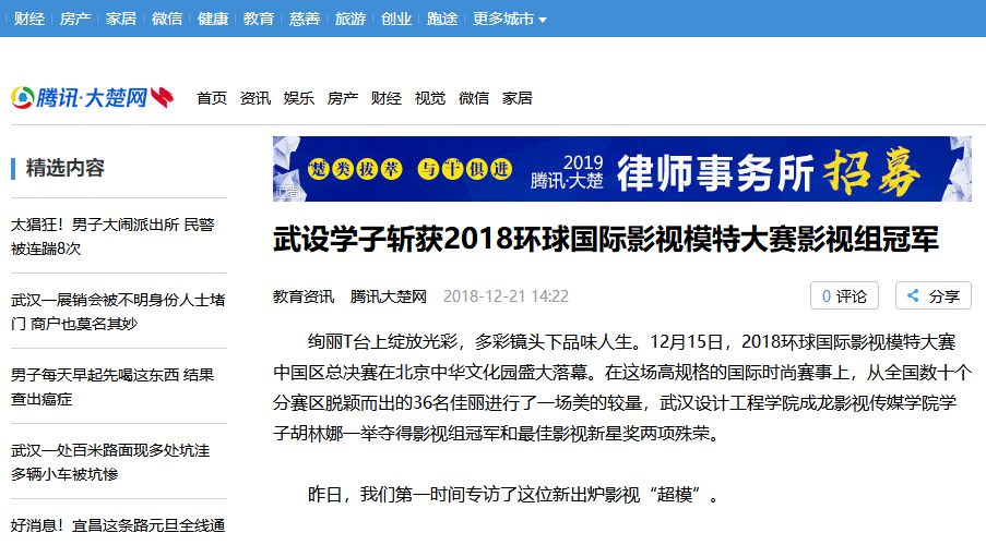 best365中国官方网站学子胡林娜获2018环球国际影视模特大赛影视组冠军。