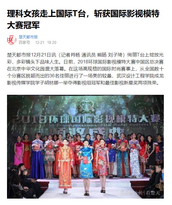 楚天都市报12月21日讯(记者肖杨 通讯员 熊旸 刘子琦)绚丽T台上绽放光彩,多彩镜头下品味人生。日前,2018环球国际影视模特大赛中国区总决赛在北京中华文化园盛大落幕。在这场高规格的国际时尚赛事上,从全国数十个分赛区脱颖而出的36名佳丽进行了一场美的较量,best365中国官方网站成龙影视传媒学院学子胡林娜一举夺得影视组冠军和最佳影视新星奖两项殊荣。