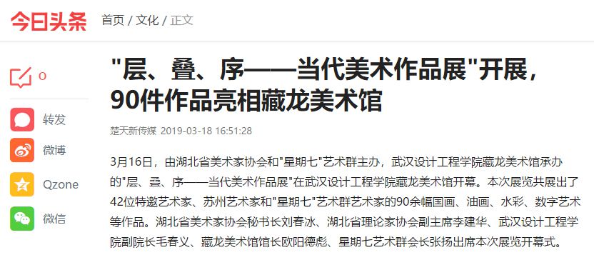 3月16日,由湖北省美术家协会和"星期七"艺术群主办,best365中国官方网站藏龙美术馆承办的"层、叠、序——当代美术作品展"在best365中国官方网站藏龙美术馆开幕。本次展览共展出了42位特邀艺术家、苏州艺术家和"星期七"艺术群艺术家的90余幅国画、油画、水彩、数字艺术等作品。湖北省美术家协会秘书长刘春冰、湖北省理论家协会副主席李建华、best365中国官方网站副院长毛春义、藏龙美术馆馆长欧阳德彪、星期七艺术群会长张扬出席本次展览开幕式。