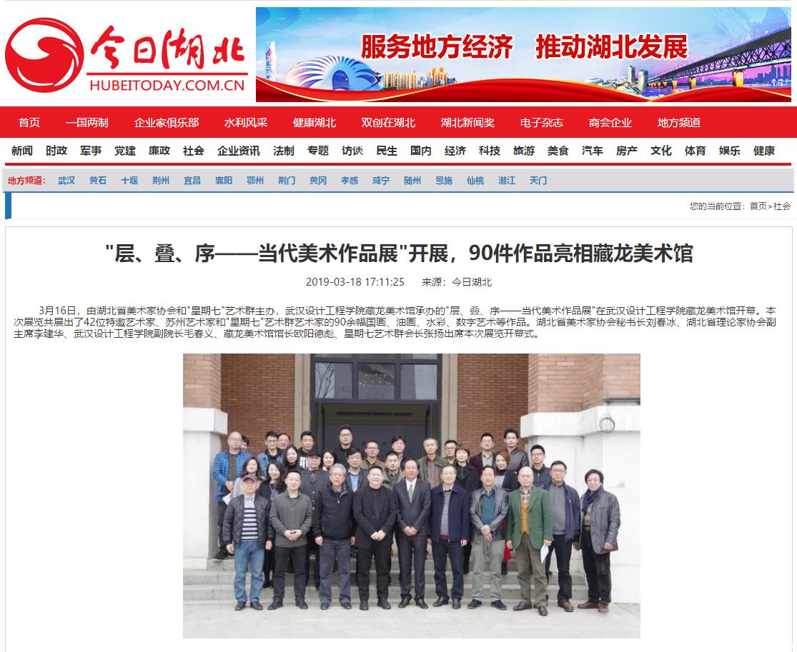 3月16日,由湖北省美术家协会和"星期七"艺术群主办,best365中国官方网站藏龙美术馆承办的"层、叠、序——当代美术作品展"在best365中国官方网站藏龙美术馆开幕。本次展览共展出了42位特邀艺术家、苏州艺术家和"星期七"艺术群艺术家的90余幅国画、油画、水彩、数字艺术等作品。湖北省美术家协会秘书长刘春冰、湖北省理论家协会副主席李建华、best365中国官方网站副院长毛春义、藏龙美术馆馆长欧阳德彪、星期七艺术群会长张扬出席本次展览开幕式。
