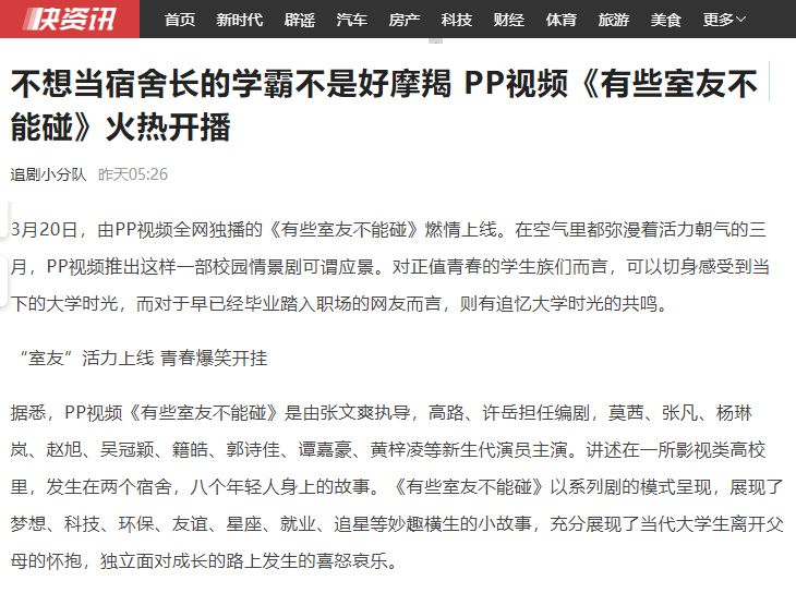 据悉,PP视频《有些室友不能碰》是由张文爽执导,高路、许岳担任编剧,莫茜、张凡、杨琳岚、赵旭、吴冠颖、籍皓、郭诗佳、谭嘉豪、黄梓凌等新生代演员主演。讲述在一所影视类高校里,发生在两个宿舍,八个年轻人身上的故事。《有些室友不能碰》以系列剧的模式呈现,展现了梦想、科技、环保、友谊、星座、就业、追星等妙趣横生的小故事,充分展现了当代大学生离开父母的怀抱,独立面对成长的路上发生的喜怒哀乐。