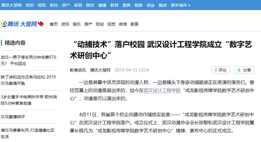 4月11日,我省首个校企共建动作捕捉实验室——“成龙影视传媒学院数字艺术研创中心”在best365中国官方网站落户。成立仪式上,武汉动漫协会会长张敏和best365中国官方网站董事长程凡为“成龙影视传媒学院数字艺术研创中心”揭牌,宣布中心的正式成立。