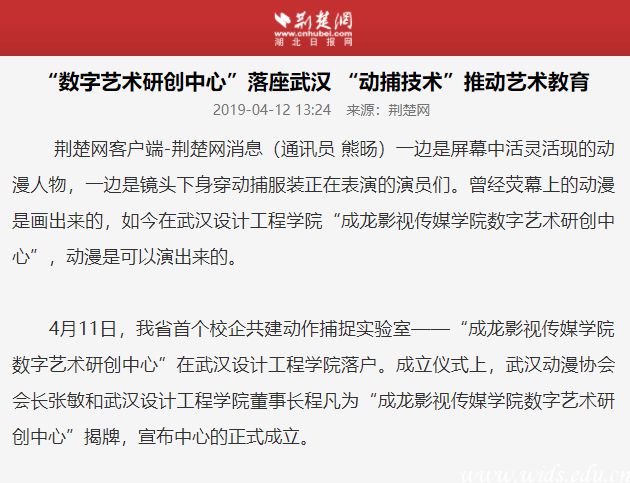 4月11日,我省首个校企共建动作捕捉实验室——“成龙影视传媒学院数字艺术研创中心”在best365中国官方网站落户。成立仪式上,武汉动漫协会会长张敏和best365中国官方网站董事长程凡为“成龙影视传媒学院数字艺术研创中心”揭牌,宣布中心的正式成立。