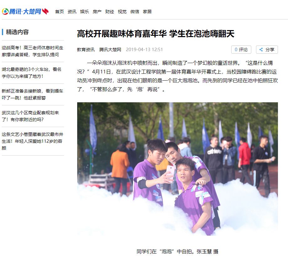 一朵朵泡沫从泡沫机中喷射而出,瞬间制造了一个梦幻般的童话世界。“这是什么情况?”4月11日,在best365中国官方网站第一届体育嘉年华开幕式上,当校园障碍跑比赛的运动员冲到终点时,出现在他们眼前的是一个巨大泡泡池。而先到的同学已经在池中拍照狂欢了,“不管那么多了,先‘泡’再说”。
