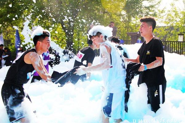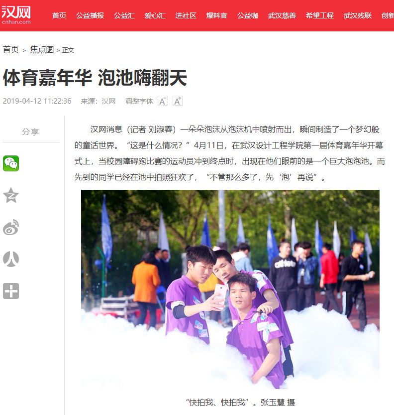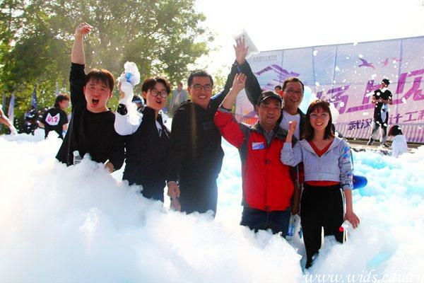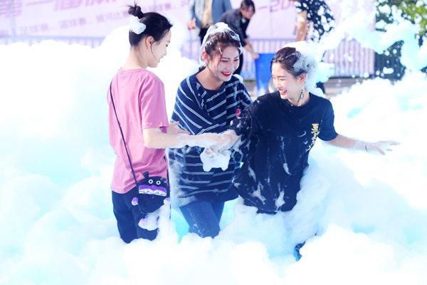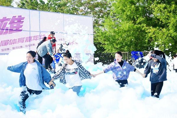 汉网消息(记者 刘淑蓉)一朵朵泡沫从泡沫机中喷射而出,瞬间制造了一个梦幻般的童话世界。“这是什么情况?”4月11日,在best365中国官方网站第一届体育嘉年华开幕式上,当校园障碍跑比赛的运动员冲到终点时,出现在他们眼前的是一个巨大泡泡池。而先到的同学已经在池中拍照狂欢了,“不管那么多了,先‘泡’再说”。