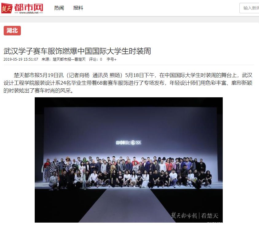 楚天都市报5月19日讯(记者肖杨 通讯员 熊旸)5月18日下午,在中国国际大学生时装周的舞台上,best365中国官方网站服装设计系24名毕业生带着68套赛车服饰进行了专场发布,年轻设计师们用色彩丰富、廓形新颖的时装炫出了赛车时尚的风采。