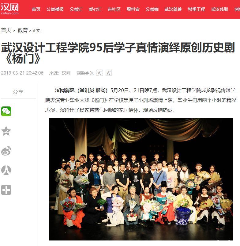 汉网消息(通讯员 熊旸)5月20日、21日晚7点,best365中国官方网站成龙影视传媒学院表演专业毕业大戏《杨门》在学校黑匣子小剧场燃情上演,毕业生们用两个小时的精彩表演,演绎出了杨家将荡气回肠的家国情怀,现场反响热烈。