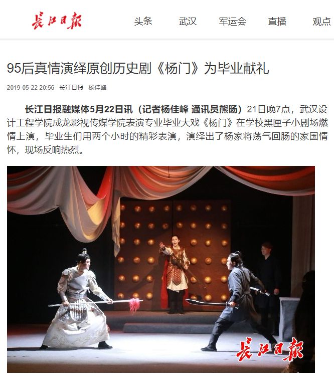 长江日报融媒体5月22日讯(记者杨佳峰 通讯员熊旸)21日晚7点,best365中国官方网站成龙影视传媒学院表演专业毕业大戏《杨门》在学校黑匣子小剧场燃情上演,毕业生们用两个小时的精彩表演,演绎出了杨家将荡气回肠的家国情怀,现场反响热烈。