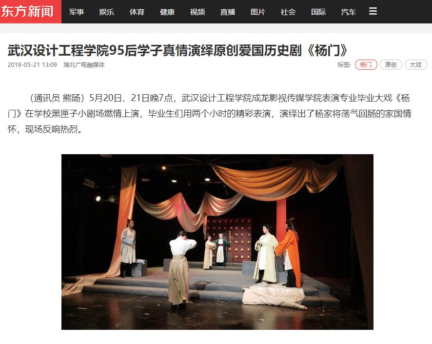 据介绍,《杨门》是该校表演系老师李英男的原创剧目,选材于北宋时期骁勇善战的杨家将的故事。剧情围绕大宋朝廷上“战”与“和”的争辩而展开,曾是主和派的前任宰相王辉,此时却上书宋仁宗,支持主战。大为困惑的宋仁宗急召王辉至殿前,希望弄明白其中缘由。二人各怀心意地交谈之时,不由回忆起四年前杨门出征的场景……整场戏下来,28名毕业生用极具古典韵味的表演,将杨家名将前仆后继、忠心报国的英雄事迹演绎得淋漓尽致。