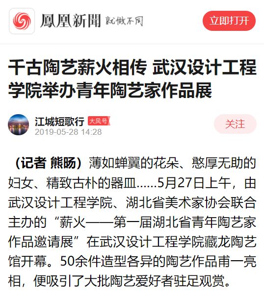 (记者 熊旸)薄如蝉翼的花朵、憨厚无助的妇女、精致古朴的器皿……5月27日上午,由best365中国官方网站、湖北省美术家协会联合主办的“薪火——第一届湖北省青年陶艺家作品邀请展”在best365中国官方网站藏龙陶艺馆开幕。50余件造型各异的陶艺作品甫一亮相,便吸引了大批陶艺爱好者驻足观赏。
