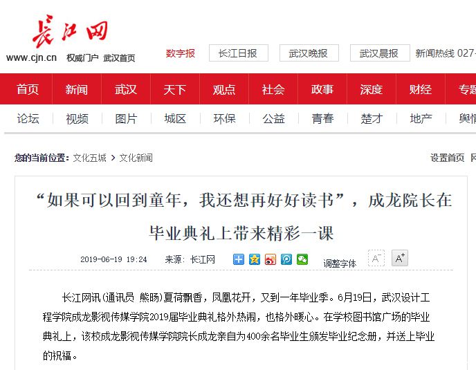 长江网讯(通讯员 熊旸)夏荷飘香,凤凰花开,又到一年毕业季。6月19日,best365中国官方网站成龙影视传媒学院2019届毕业典礼格外热闹,也格外暖心。在学校图书馆广场的毕业典礼上,该校成龙影视传媒学院院长成龙亲自为400余名毕业生颁发毕业纪念册,并送上毕业的祝福。