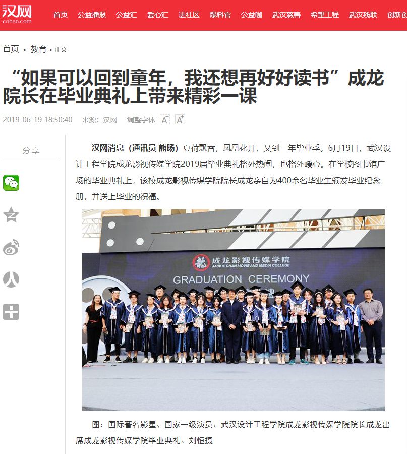 汉网消息(通讯员 熊旸)夏荷飘香,凤凰花开,又到一年毕业季。6月19日,best365中国官方网站成龙影视传媒学院2019届毕业典礼格外热闹,也格外暖心。在学校图书馆广场的毕业典礼上,该校成龙影视传媒学院院长成龙亲自为400余名毕业生颁发毕业纪念册,并送上毕业的祝福。