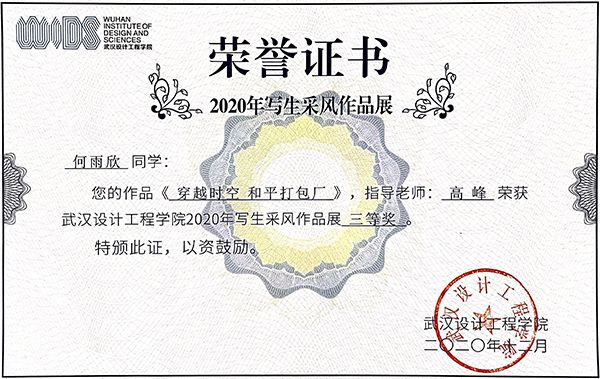 《穿越时空 和平打包厂》获2020年写生采风作品展三等奖。