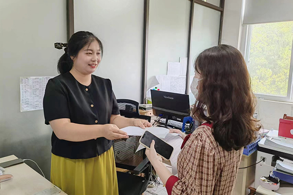 “许老师总是能给我们一种天然的亲切感,遇到任何问题都会给予耐心细致地解答,在与许老师的接触中,我感受到了真诚与关怀。”许杨杨热心接待前来办事的每一位师生,细心处理每一份学生需要的教务材料,“教务管理工作虽然政策性强,但我觉得可以通过我们的服务使它更有温度。”遇到转专业等学籍异动的学生,许杨杨则会询问他们在新的班级里适不适应,有没有什么困难;遇到毕业生来盖章,许杨杨都会与他们亲切交谈,询问学生就业意向或升学打算,给学生们加油鼓劲。