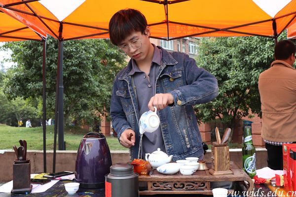 茶艺社社员现场用烫杯温壶、洗茶、冲泡、封壶、分杯……泡茶手艺展现出茶艺文化的独特韵味。邹昱媛 摄