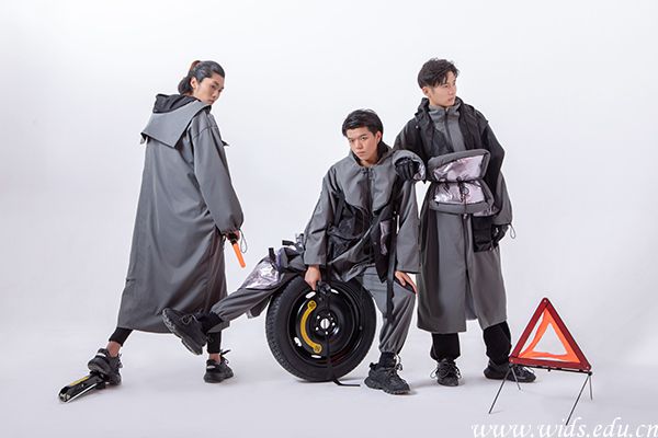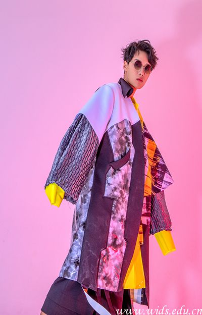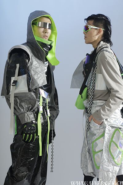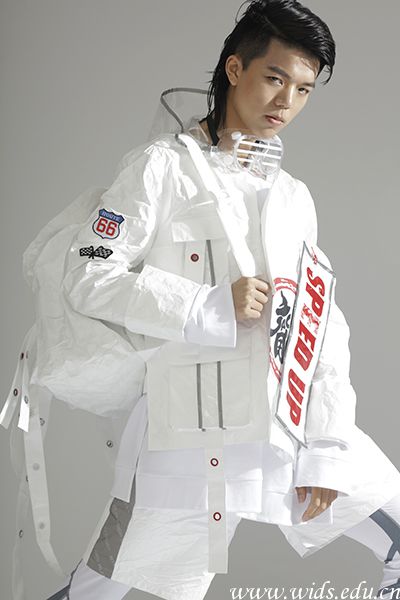 局部的图案运用,给人视觉的撞击带来了不一样的感觉,色彩不一的冲击与图案本身的细节,更是添了精彩。这个系列服装运用对称、均衡、分割等表现手法,多样又统一,不失单调。反光条也是多处运用,呈现视觉上的冲击与吸引,像赛车运动给人的仰望与喝彩一样。面料主要是以杜邦纸为主面料,杜邦纸给人印象如同纸一样薄而易破,实际上,杜邦纸很结实,这个面料不仅时尚,带来更多的是惊喜。不经意的褶皱带来的纹理与质感,让人惊喜。像赛车一样,涅槃重生的精神。不为谁而打败。