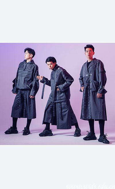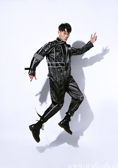设计说明:“道”,可以延伸为道路和日本武士道精神。服装色彩搭配上以黑、白、红为主,与赛车精神相呼应。面料上综合运用了漆皮、杜邦纸以及毛呢,通过再造手法对面料肌理进行重组解构,丰富了服装廓形。服装中加入了手绘的日式鬼怪以及喷绘涂鸦元素图案,充分展现了日本武士道精神中特有的坚韧。
