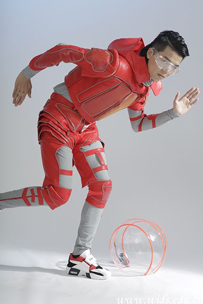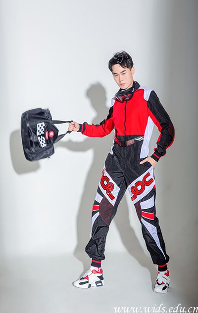 作品灵感选自F4赛车的狂野和激情,色彩的绚烂融入街头时尚感,将赛车竞速元素更迎合当下年轻人独立自信的坚毅个性,借此为追梦者发声,他们挑战世俗,勇于突破自我的完美表现。服装造型简洁、线条流畅,运用简单的分割,整体的搭配,塑造出青春靓丽的形象!色彩上整个套装采用黑色为主,白色和红色结合搭配,大块的黑色布料配上红色和白色于整体,透露出活泼。 面料上考虑实穿性,运用轻薄的运动面料,并配以绣标、logo等元素,时尚且有运动感。膝盖和胳膊肘等部位为表达防护的感觉,采用加棉走线的工艺,工艺上镶反光条,以及PVC反光条编织成格纹,融入了时尚酷炫的未来感,以表达赛车运动的态度为核心。