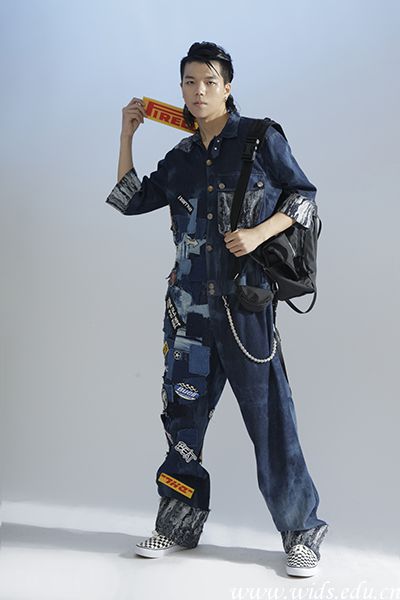 设计说明:本系列设计主题取名《VAGRANT》,意为“流浪者”,以嘻哈牛仔风贯穿整个系列,旨在探讨赛车运动与时尚之间的关系。本系列采用了拼接的面料再造的方法,通过将不同肌理表面的牛仔面料进行重组、拼接,生成了富有创意和表现力的全新面料组合,令简单平常的牛仔面料在运动与激情、时尚与流行中重新焕发了活力和生机。