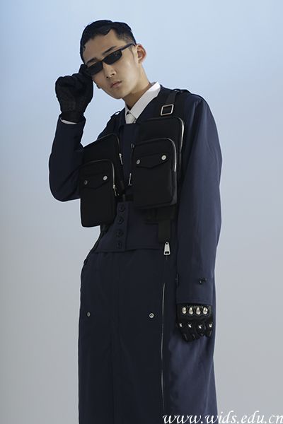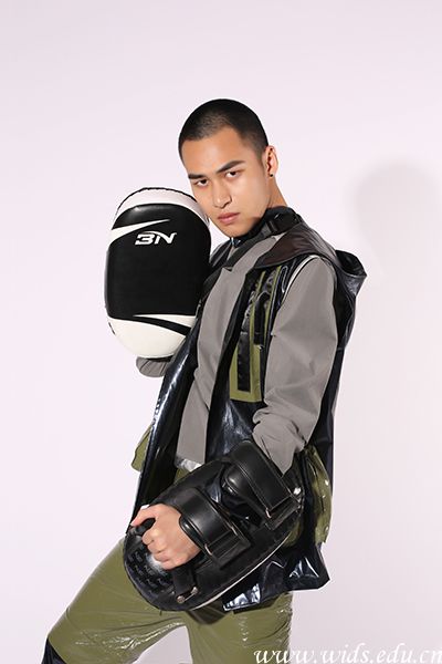 设计说明:本系列作品名称中文释义是尼龙金属,所以在我的灵感来源中包含了大量的赛车金属元素,并借用了赛车外形为服装的大体阔形,在面料的选择上,我选用了杜邦材料和反光金属材质以及羽绒做拼接,希望用不同质感的面料来做碰撞,凸显出服装的质感。在颜色的选择上,一方面是根据我个人的喜好,另一方面也是了解了本年度的流行色的预测趋势,所以我选用了以豆绿色和深蓝色为主要色彩,并加入黑色以及亮橙色来做一个色彩上的对比,在颜色上形成反差效果,然后在服装配饰和道具的选择上,我运用了铁链,拳套以及一些运动装备作为点缀,起到画龙点睛的作用,丰富了整体的层次。