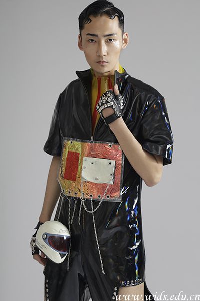 设计说明:此系列服装灵感来源于赛车电影《速度以激情》。服装以绚丽的颜色、皮革的质感、面料绚丽的反光等具有强烈的视觉冲击的设计手法来表现。电影情里相互追逐,只能看见对方的车尾。充满了犯罪,色情的剧情。