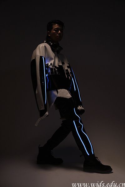 设计说明:“TRON”这一系列服装以“赛车•运动•时尚”作为主题。通过发散思维对赛车这一主题展开思考,提取出:电影《创:战纪》、赛道、黑白格、圆这几个关键词。本系列以电影《创:战纪》为主基调,电影里摩托赛车比赛的片段中赛车相撞时程序破碎的画面,人物服装及赛车中的灯条,提取做为服装细节。首先用到游戏跑跑卡丁车的赛道,以此为基础创造出新的类似赛道的图案做服装细节,再由电影《创》中程序相撞破碎的画面联想到现实赛车中的死亡,用提取的黑白格元素做出破碎的图案,来体现赛车这类竞速运动与死亡的联系。整个系列服装以白色和黑色哑光PU皮为主面料,黑色漆皮面料点缀,局部再加以冰蓝光灯条装饰。将赛车文化所产生的时尚元素运用到服装上,并与科技相结合。