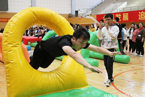当天,连绵的小雨没有停歇,然后大学生活动中心里的老师却越聚越多,大家的比赛热情丝毫未受到天气的影响。首先进行的是翻山越岭比赛,每队成员需要依次穿过平衡木、跨栏、钻网、鱼跃龙门等四个障碍物。比赛以接力赛形式展开,每支代表队共六人,用时最少的队伍获胜。赛场上,大家一改往日的严肃,你追我赶,好不热闹。