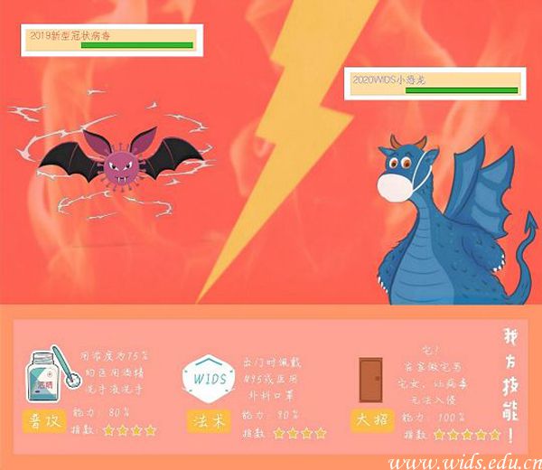 设计说明:武设化作一只战"疫"小恐龙向新型冠状病毒发起强力进攻啦!疫情虽然严重,但希望我们每一个武设学子都能积极乐观,把这次战"疫"行动当作一场游戏PK一样!同学们要使用小恐龙的每一个技能:勤洗手、戴口罩、宅!尤其是终极技能"宅"!面对疫情我们千万不能掉以轻心,使用好这些技能,才能战胜病毒!