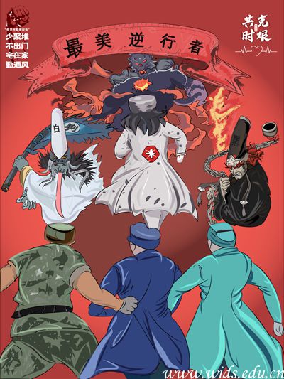 设计说明:己亥之末,庚子启元。瘟神突现,名之新冠。此病毒使天地混沌,山河皱眉,美丽春光,骤然灰黯,然危难之时,国有柱磐。除夕之夜白衣战士辞别老幼,逆行而上,出征一线,誓与死神做最后的斗争。虽山川异域,但风月同天,全国人民,阻击疫魔,为取得最后的胜利,誓与病魔斗争到底。
