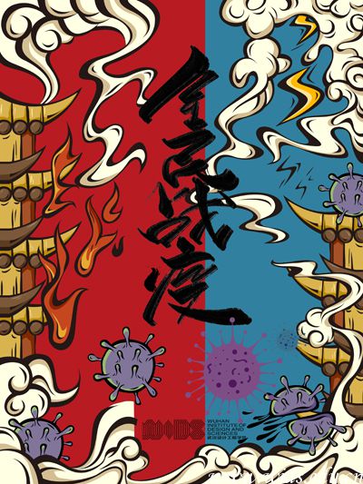 设计说明:本作品灵感来源于此次大范围爆发的新型冠状病毒,采用手绘板绘的方式。色彩方面,左侧红色背景代表着火神山的火,右侧蓝色背景代表雷神山的雷。元素方面加入了云雾、黄鹤楼和新冠状病毒,云雾笼罩着黄鹤楼,空气中都充满着病毒。因为疫情的来临使武汉陷入了危机,全国人民忧心忡忡。因此呼吁全国人民团结起来,共同战胜疫情!