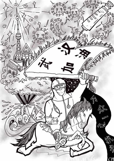 设计说明:医护人员身穿防护服,骑上战马,参加一场没有硝烟的战斗。手拿战旗,上面“武汉加油”表达我们对抗击病毒必胜的信心。万众一心,抗击病毒的彩带把我们的心紧紧握在一起!作为一名普通的大学生,虽然不能像那些医护人员一样上战场,但可以通过一幅画来表达在武汉浴血奋战的工作人员致敬!你们辛苦了!希望疫情早点结束。愿医护人员平安凯旋,疫情结束后,我们一定要善待世界,善待身边的人,珍惜现在的美好生活,懂得感恩。武汉加油!