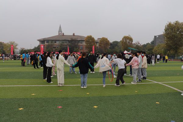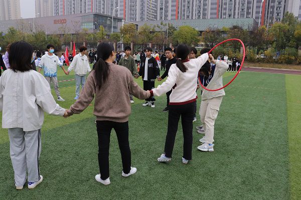 拉起的手,围成的圈,呼啦圈一起一落,一圈到底比赛开始了,“这个呼啦圈好像被赋予了魔性,后面越来越顺利,轮到我的时候我迅速蹲下,敏捷地从呼啦圈中跳了出来,我的心落了下来,赶紧用臂力抛给下一个同学。”食品与生物科技学院学生潘康轩在赛后说到。