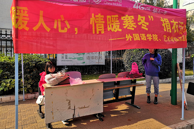 醒目的条幅悬挂在帐篷上,吸引着同学们的视线,志愿者们积极向路过的学生宣传讲解,前来捐赠的人络绎不绝。志愿者们认真地记录捐赠者个人信息,同时也对他们表示出了真诚的感谢,并对捐赠的衣物进行筛选、整理、分类和打包。后期这些衣物将进行清洗、消毒,并且会及时寄送到贫困山区,帮助他们度过一个温暖的寒冬。