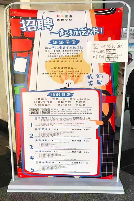 达达学堂是一家无边界儿童艺术成长学院,现设有自然艺术课、博物馆艺术课、绘本艺术课等课程体系,旨在给孩子最好的艺术启蒙。招聘会由企业宣讲、企业招聘等部分组成,在企业宣讲部分中,张佳慧向大家介绍了达达学堂给员工的福利待遇,如公费培训、五险一金、带薪年假等,充分展示了体恤员工的企业文化,此外,她还介绍了应聘的基本岗位、企业的基本情况,进一步加深了应聘者对达达学堂的了解。她指出:“达达学堂带给我变化是非常大的,它使我对我的前途更加充满信心。”并欢迎对此有兴趣的同学前来了解咨询。