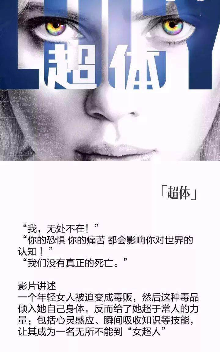 《超体》讲述一个年轻女人被迫变成毒贩,然后这种毒品倾入她自己身体,反而给了她超于常人的力量:包括心灵感应、瞬间吸收知识等技能,让其成为一名无所不能的“女超人”。